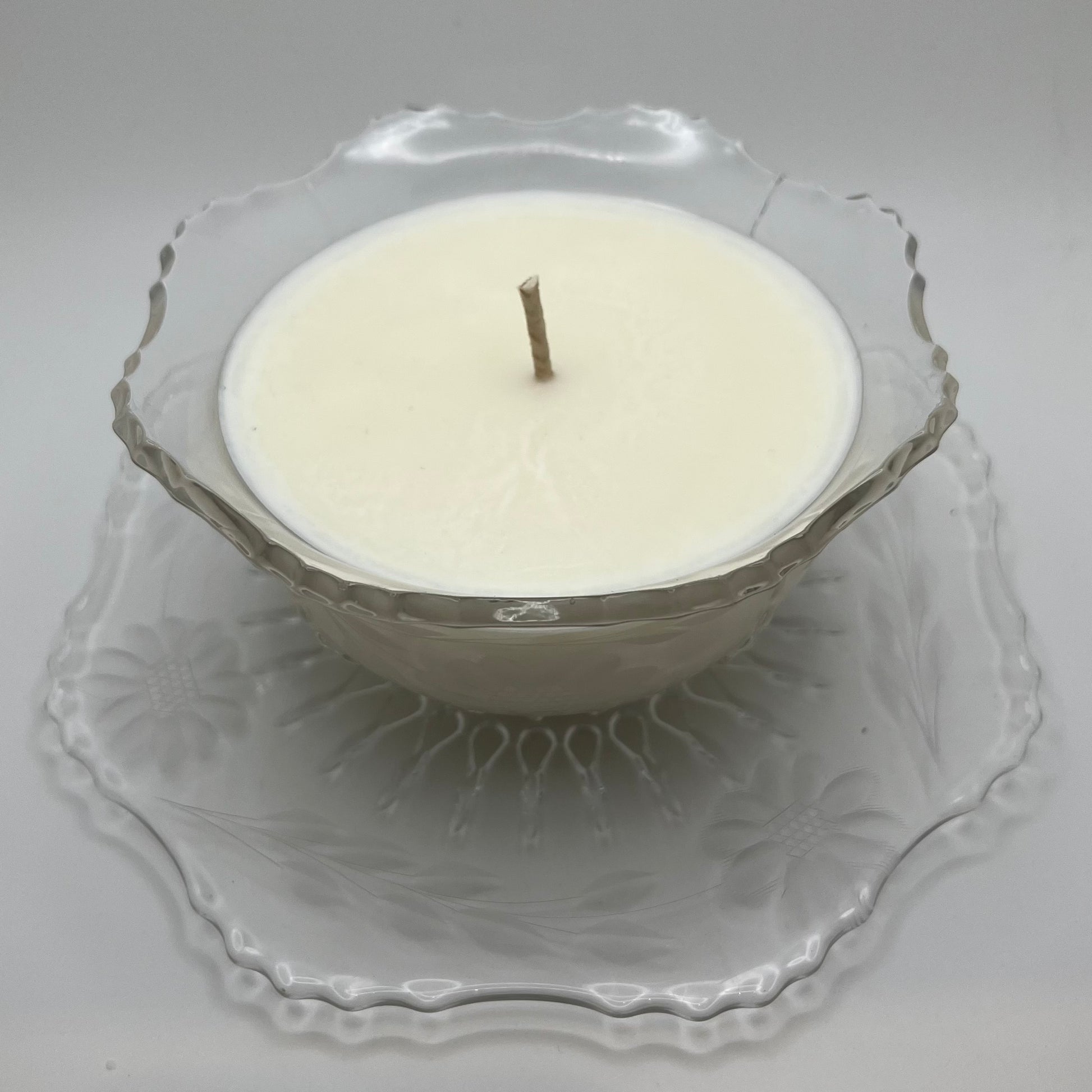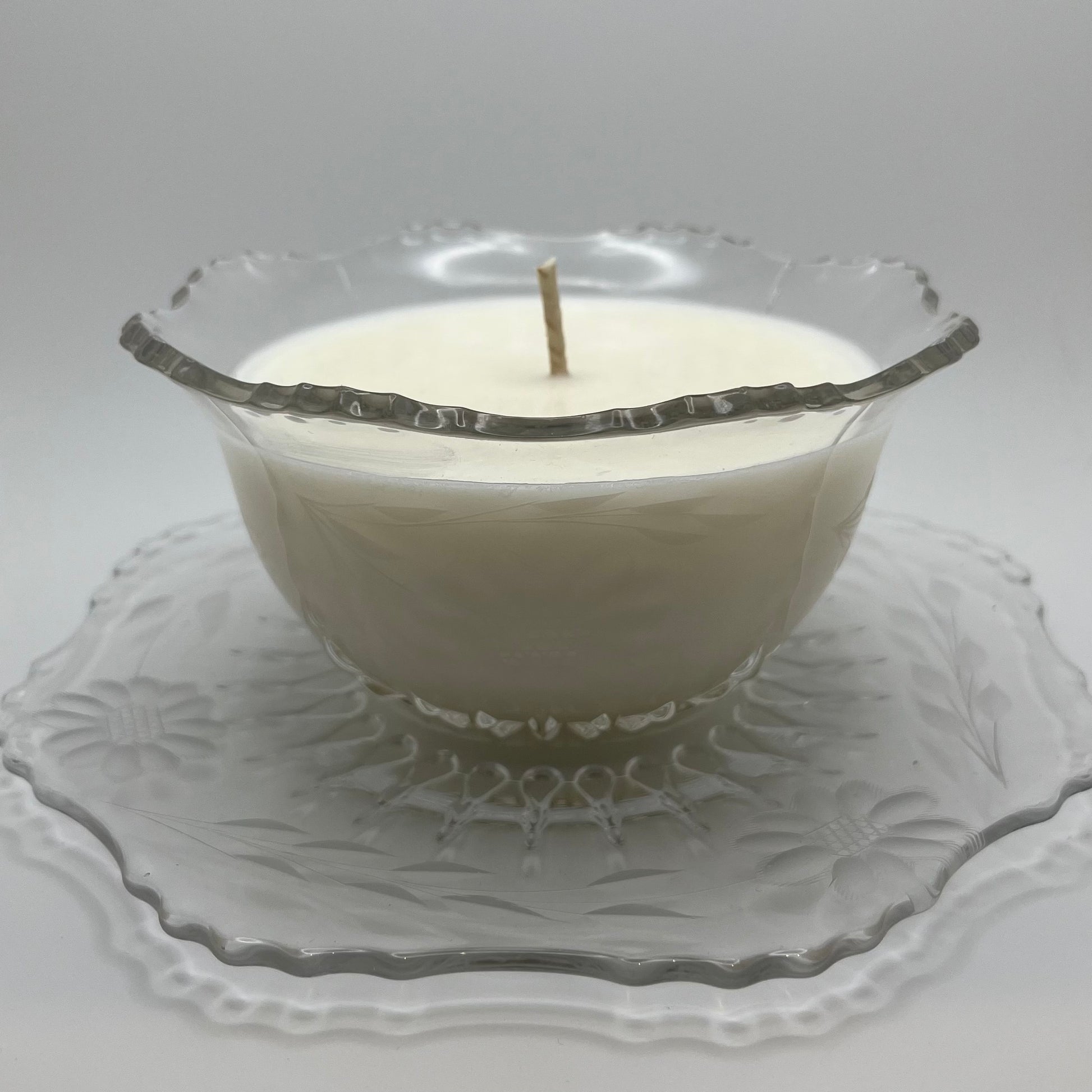Crystal dish and saucer up-cycled into a cactus & sea salt scented candle.