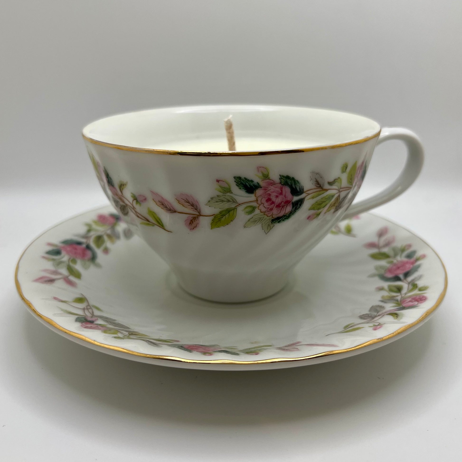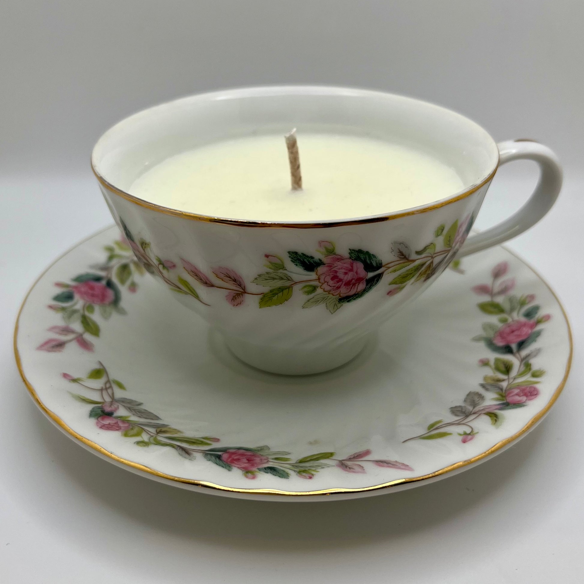 Tea cup & saucer up-cycled into a eucalyptus scented candle.