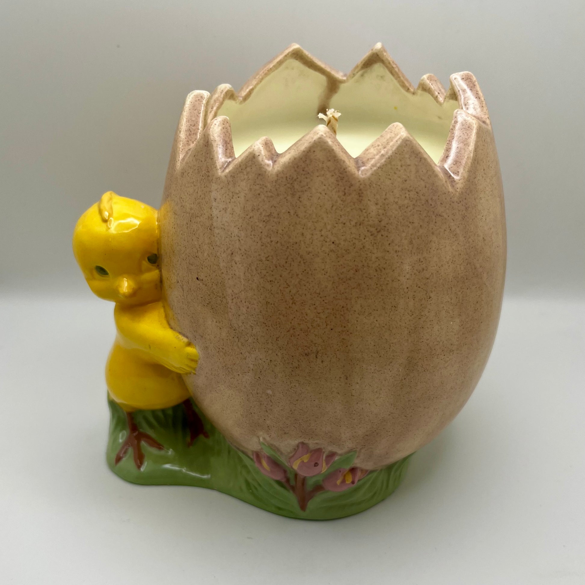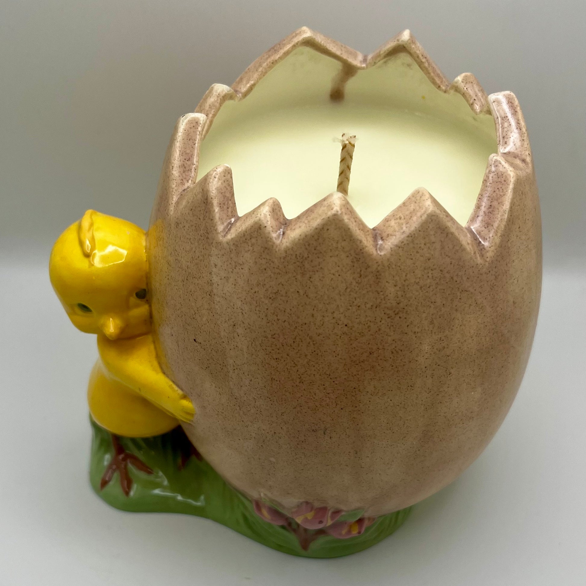 Cracked Easter egg with chick up-cycled into a ginger root & ylang ylang scented candle.