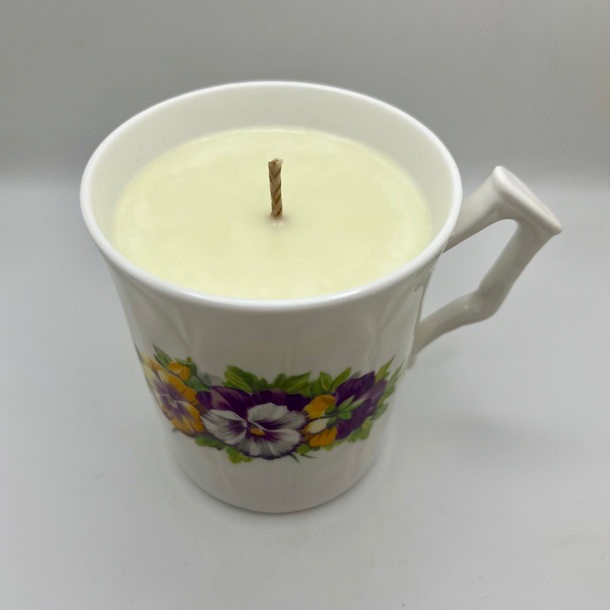Floral China mug up-cycled into a grapefruit & bergamot scented candle.