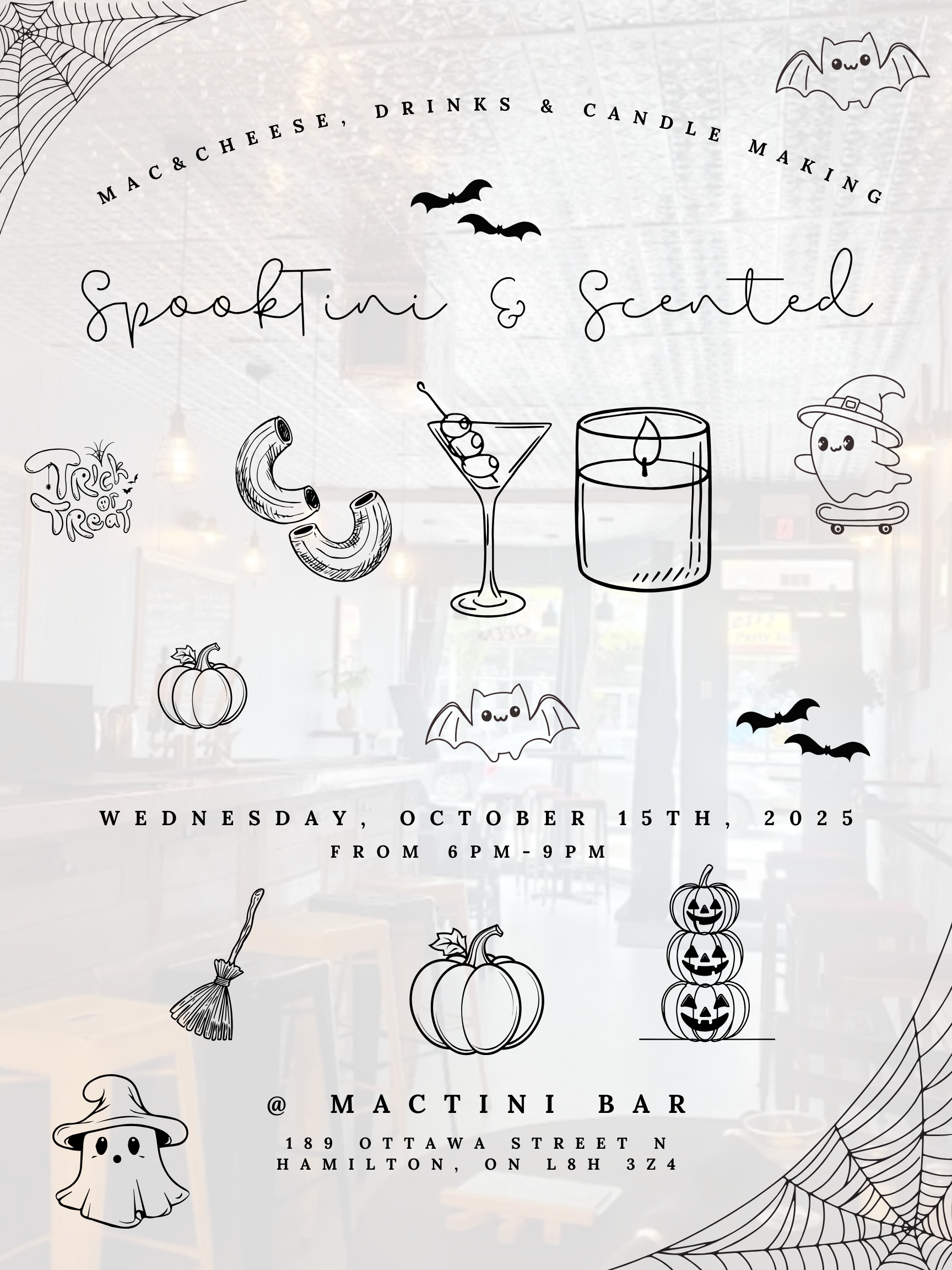 Experience a spooky scary evening with SpookTini & Scented! Indulge in original Mac & cheese (upgrade available), sip on any mixed drink & get crafty with a DIY candle making class.