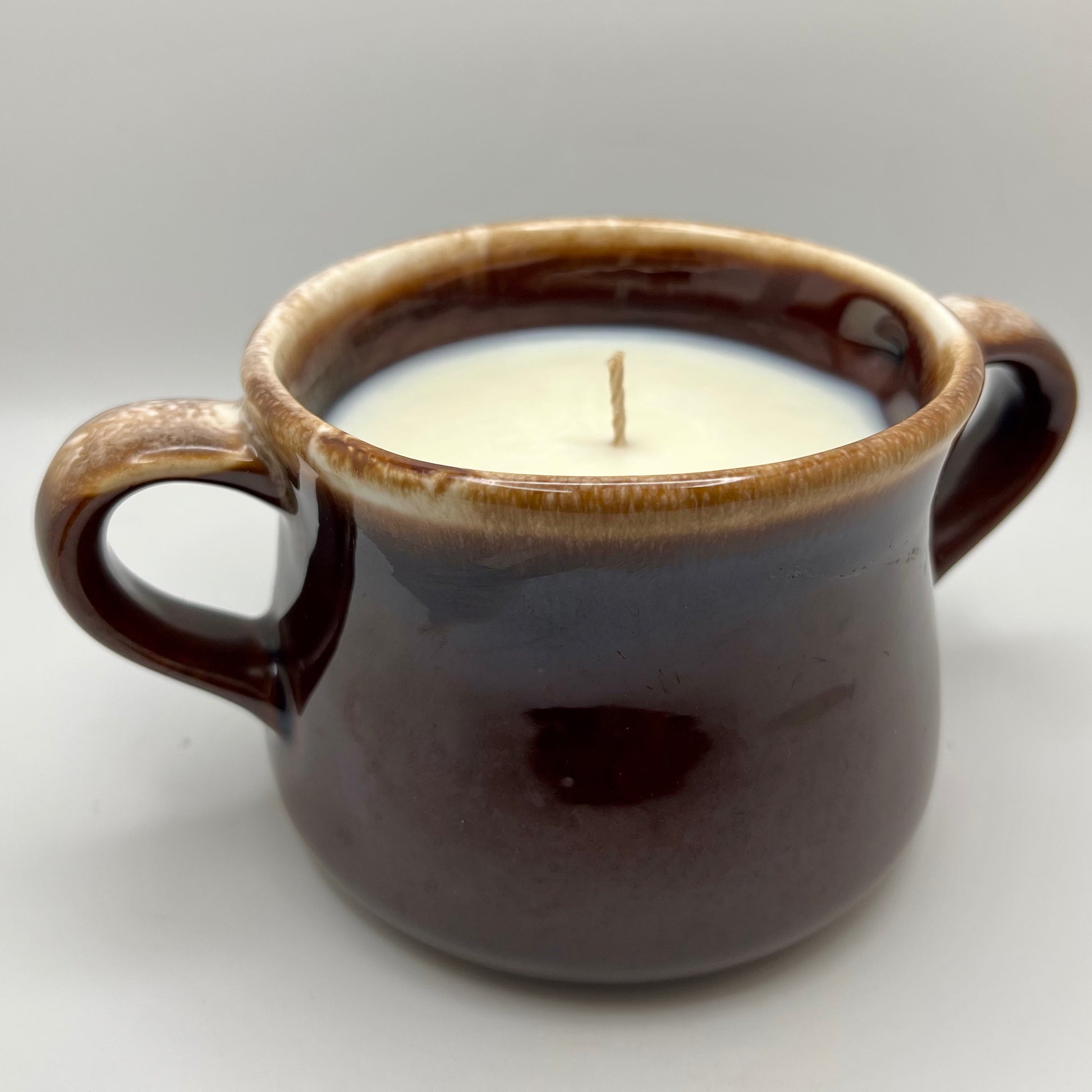 French Onion soup bowl up-cycled into an earl grey scented candle.