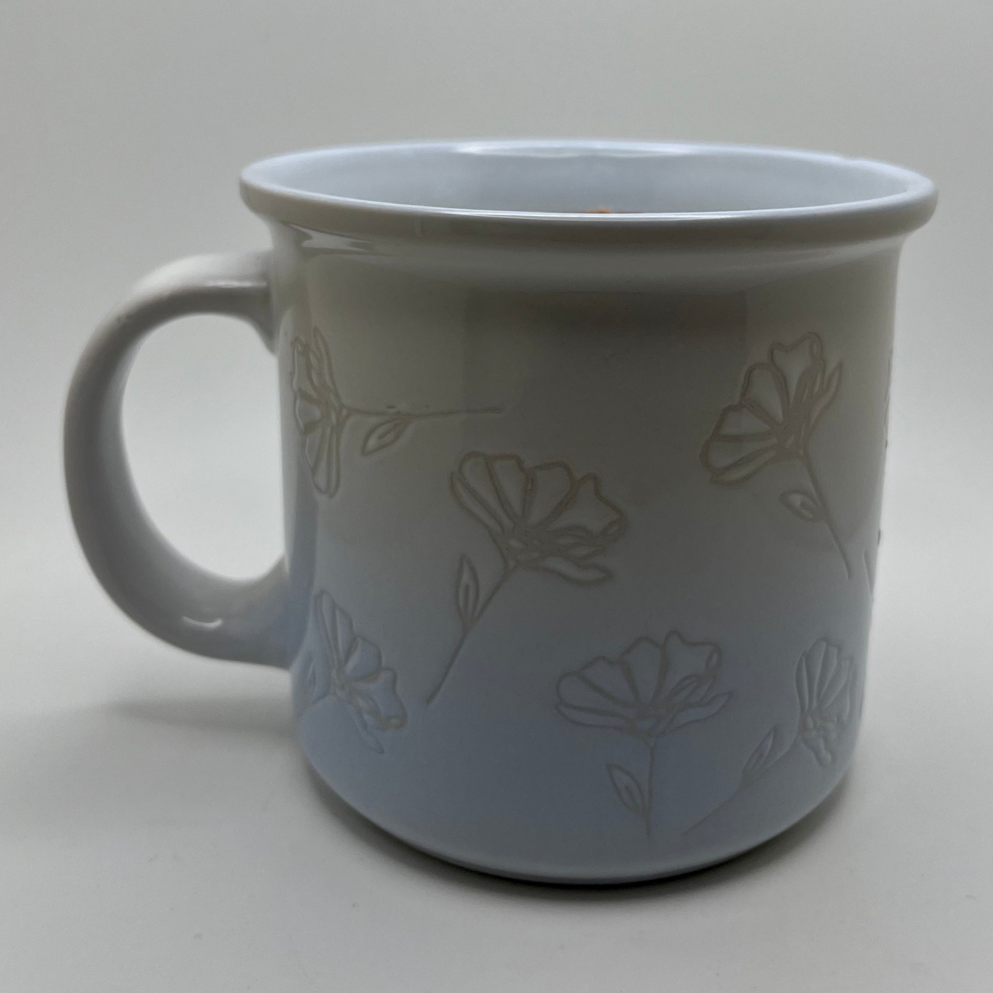 Blue floral mug up-cycled into a wood sage & sea salt scented candle.